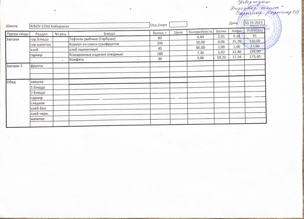 Утвержденное меню на 19 октября 2023 года