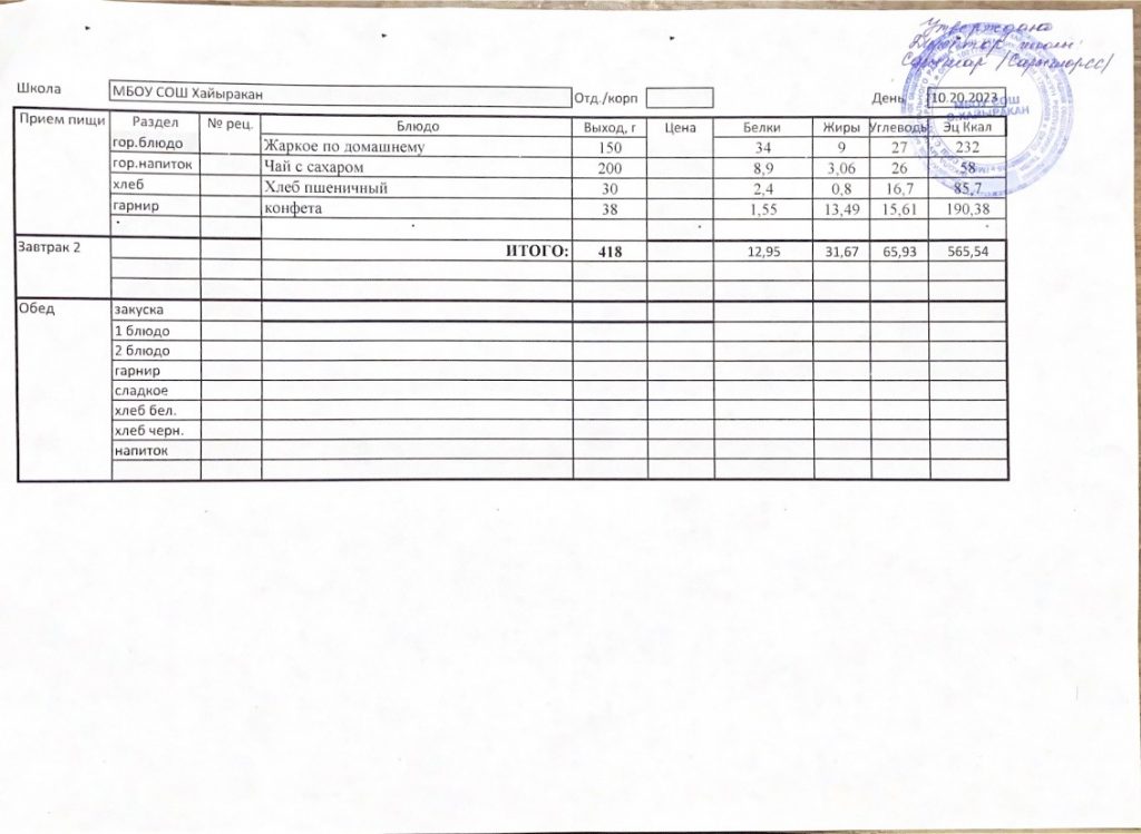 Утвержденное меню на 20 октября 2023 года