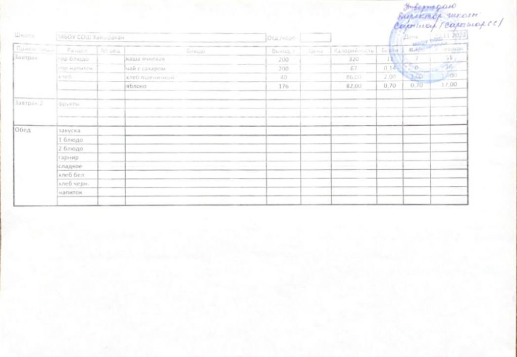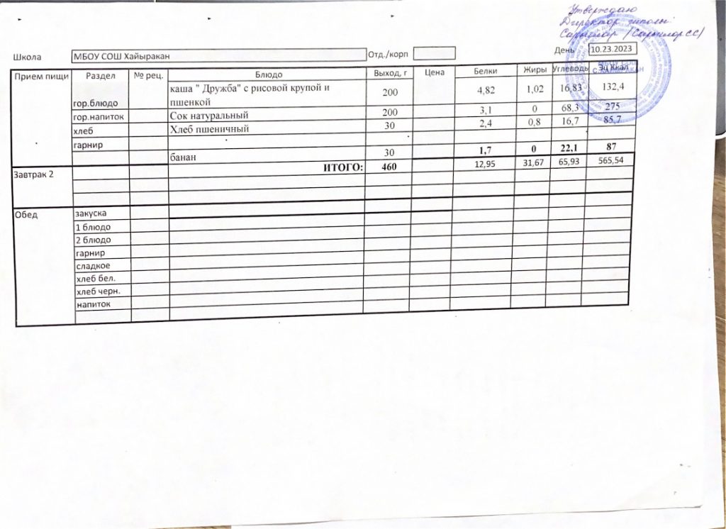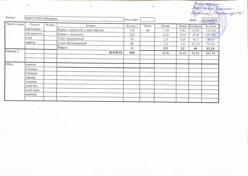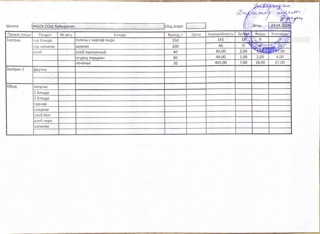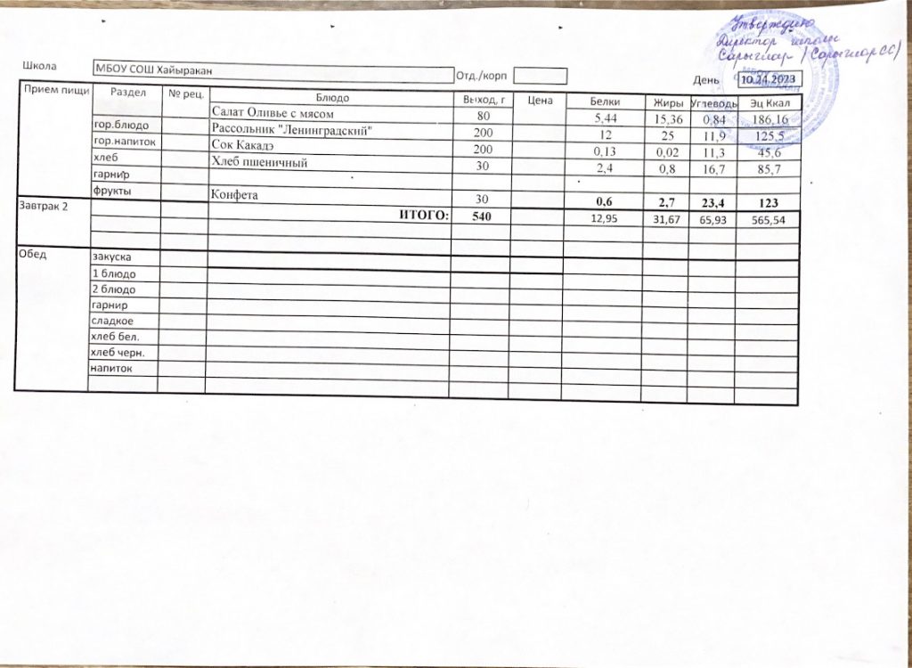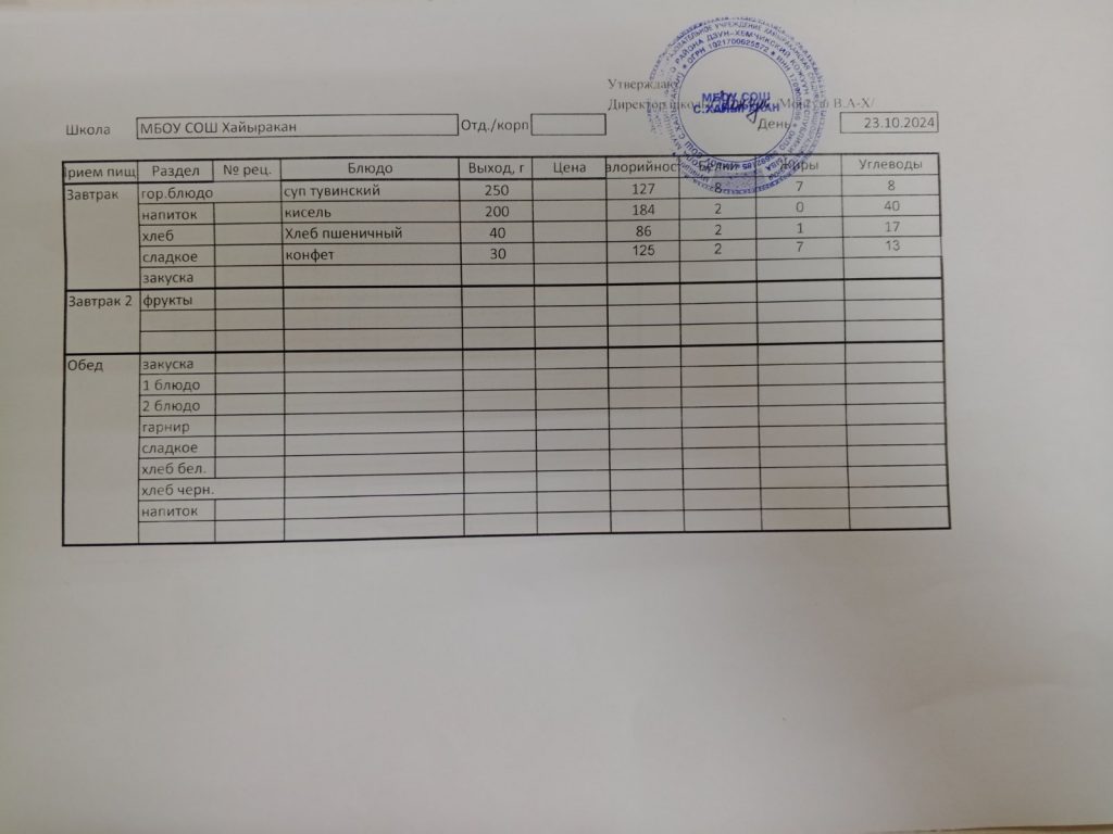 Утвержденное меню на 23 октября 2024 года