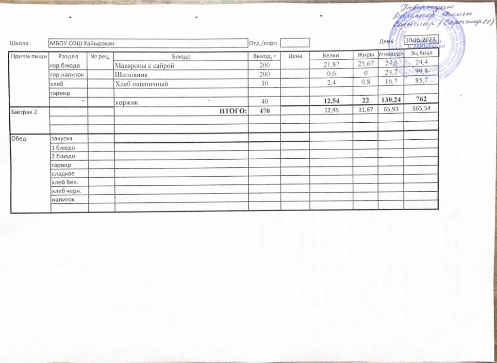 Утвержденное меню на 26 октября 2023 года