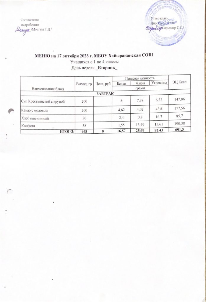 Утвержденное меню на 17 октября 2023 года