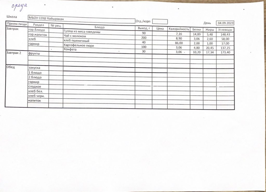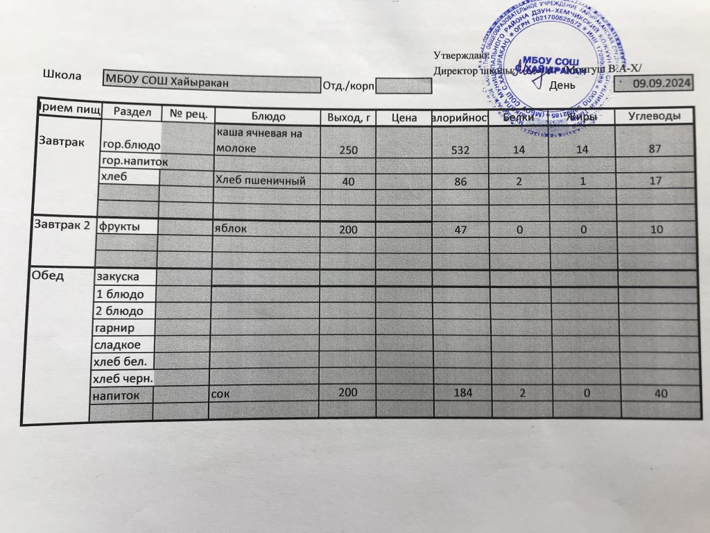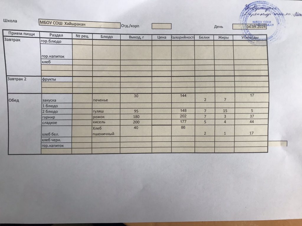 Утвержденное меню на 04 сентября 2024 года