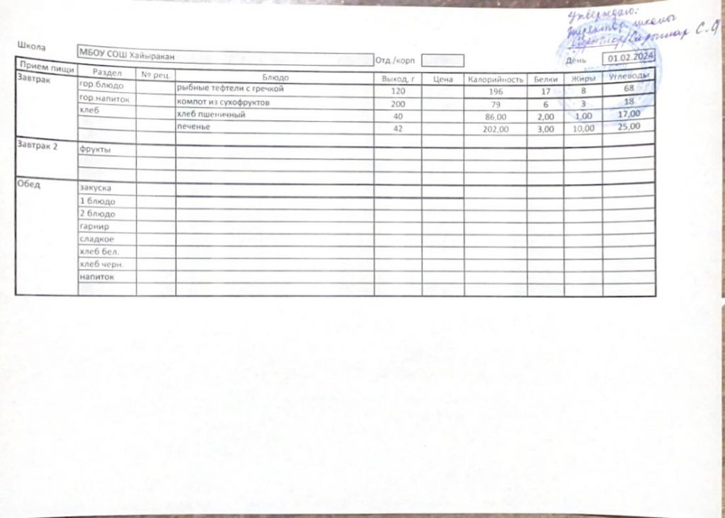 Утвержденное меню на 01 февраля 2024 года
