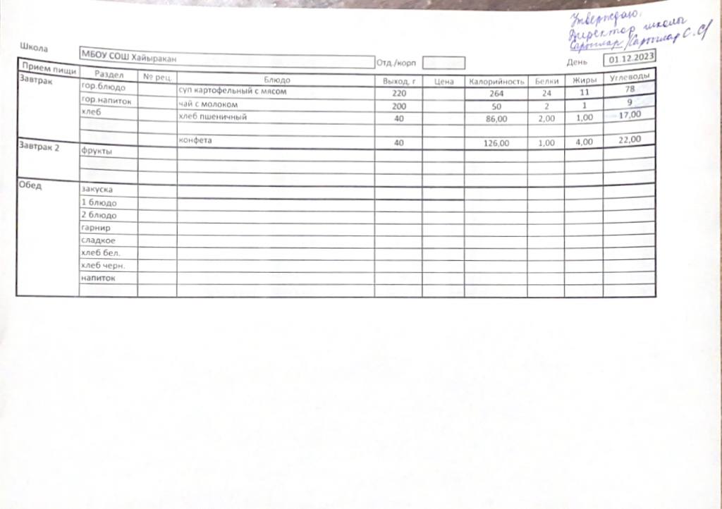 Утвержденное меню на 01 декабря 2023 года