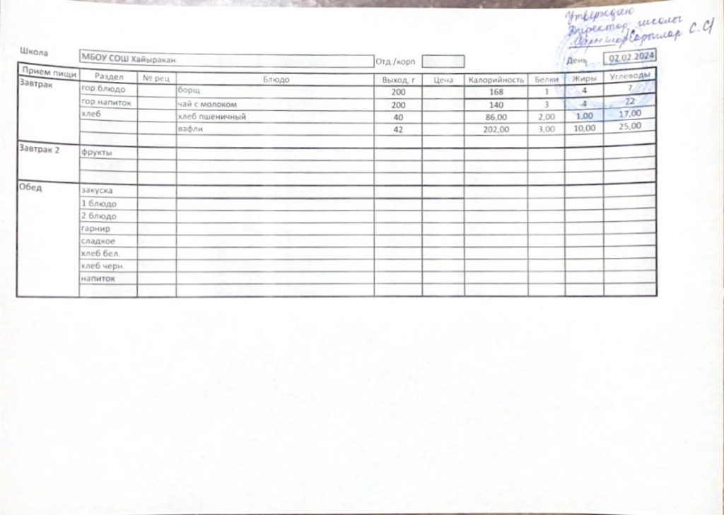 Утвержденное меню на 02 февраля 2024 года