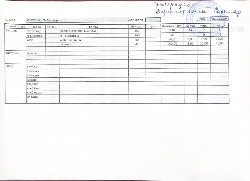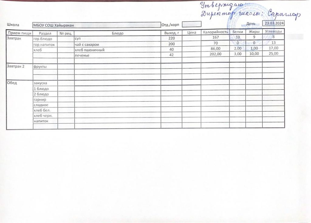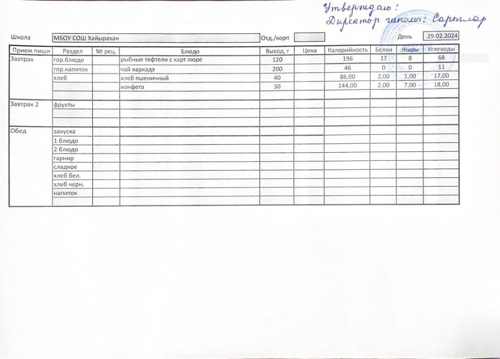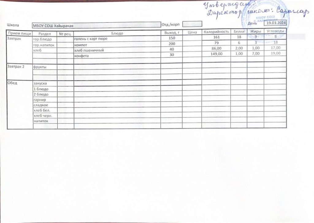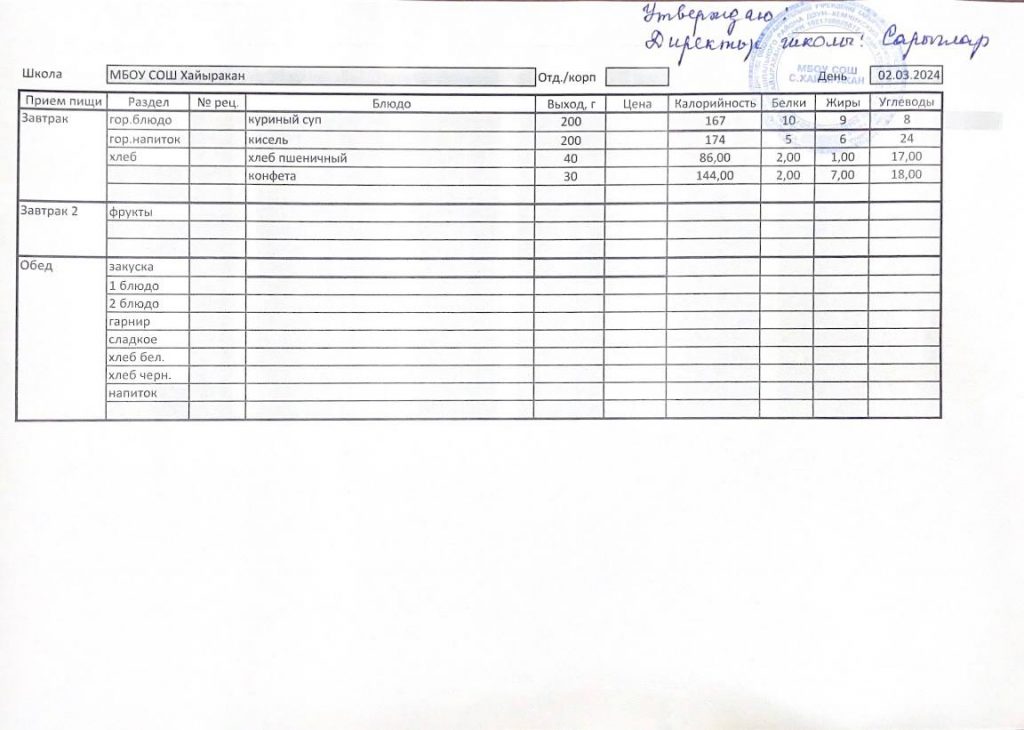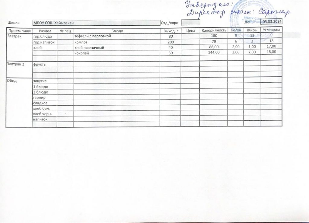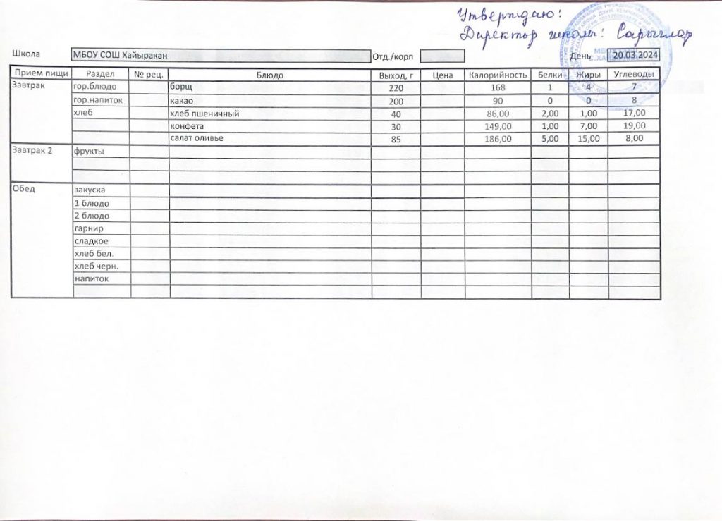 Утвержденное меню на 20 марта 2024 года