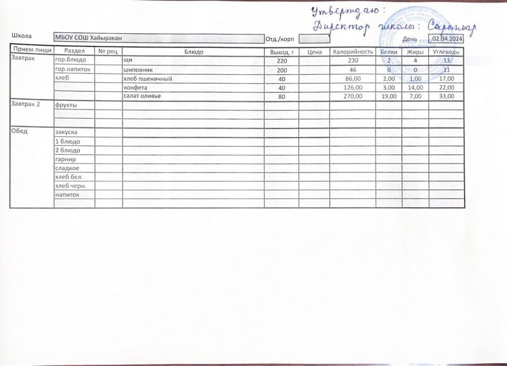 Утвержденное меню на 02 апреля 2024 года
