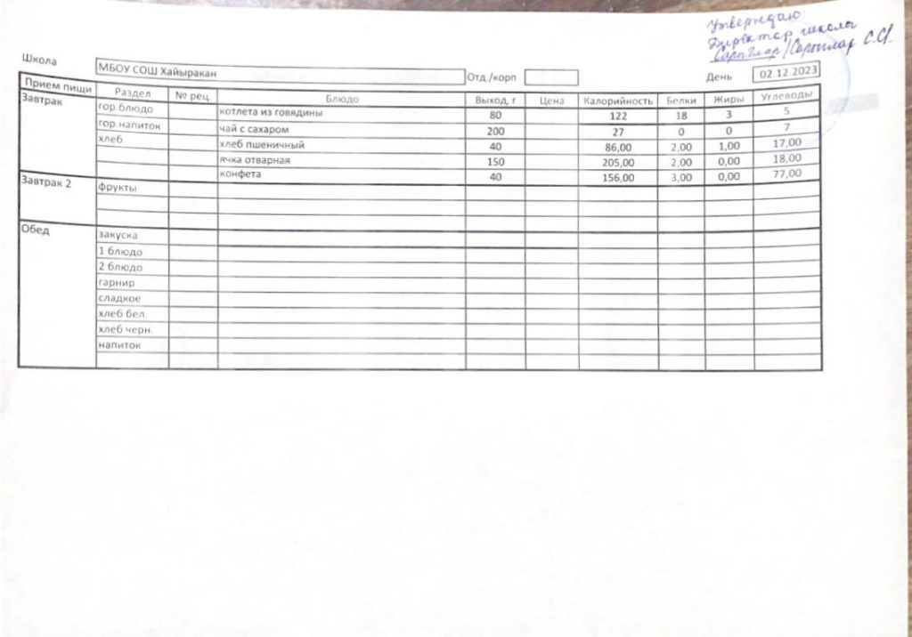 Утвержденное меню на 02 декабря 2023 года