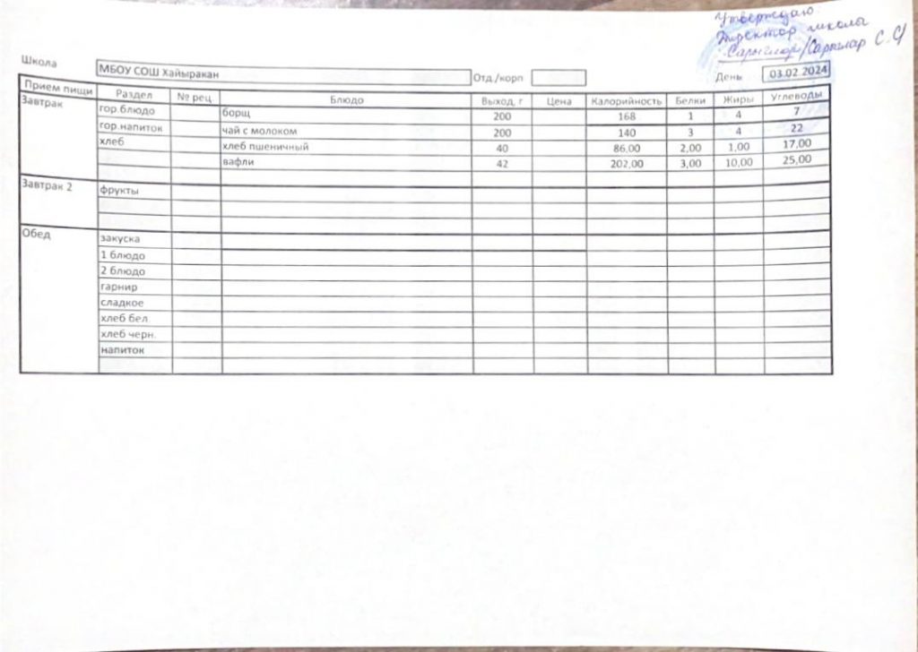 Утвержденное меню на 03 февраля 2024 года