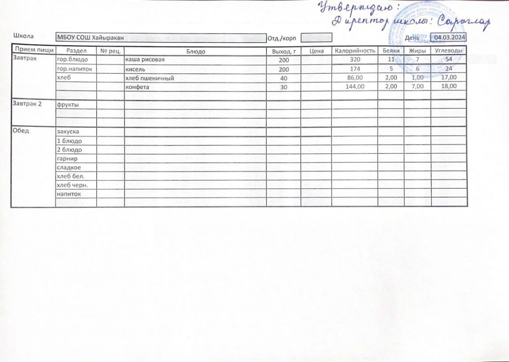 Утвержденное меню на 04 марта 2024 года