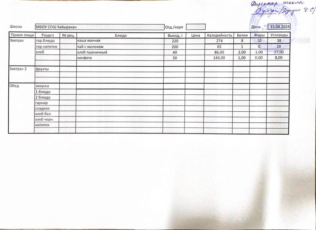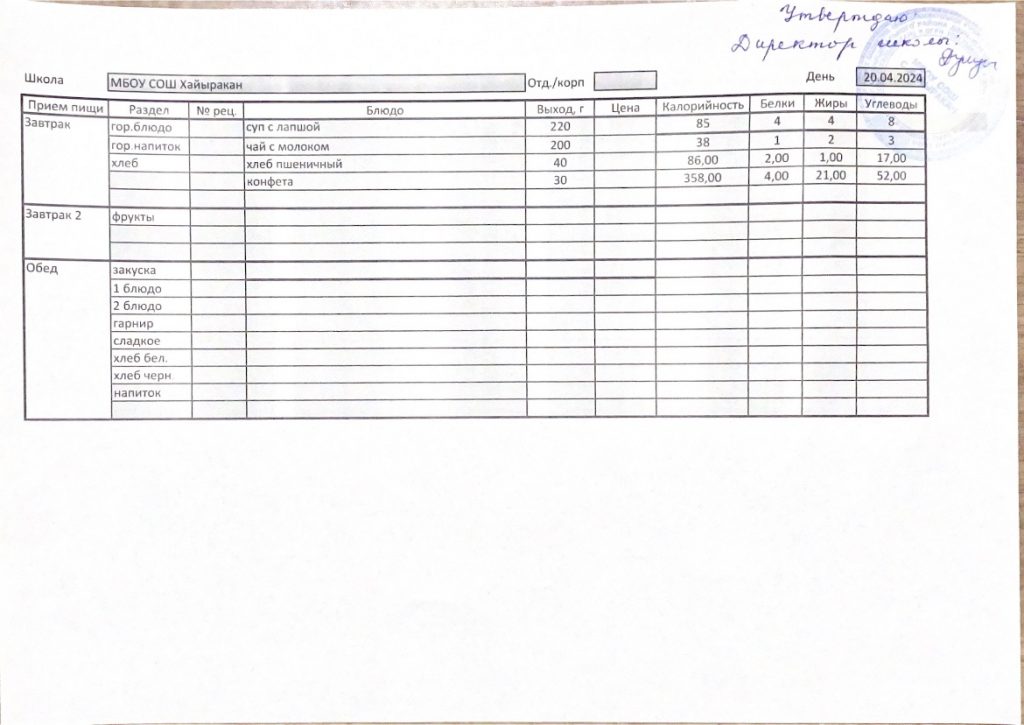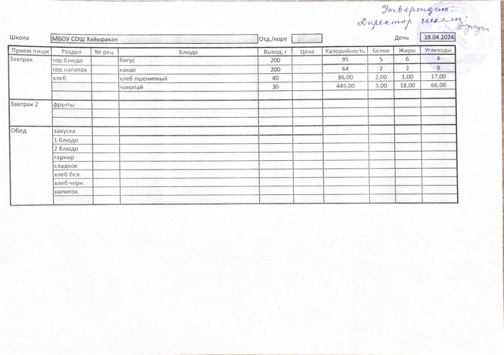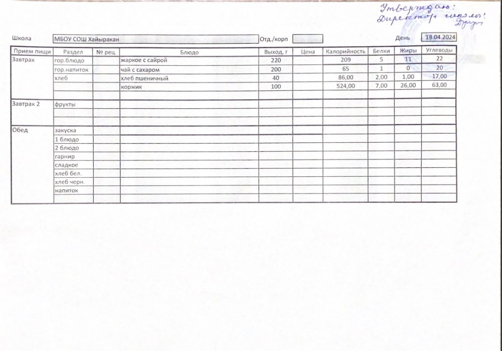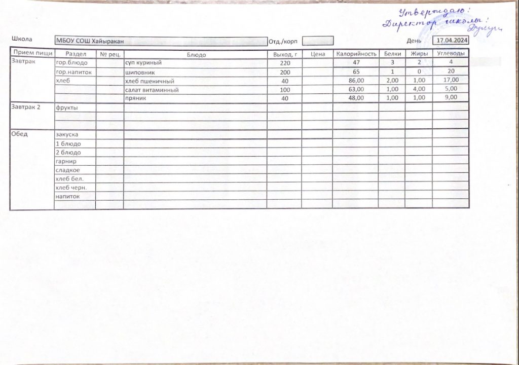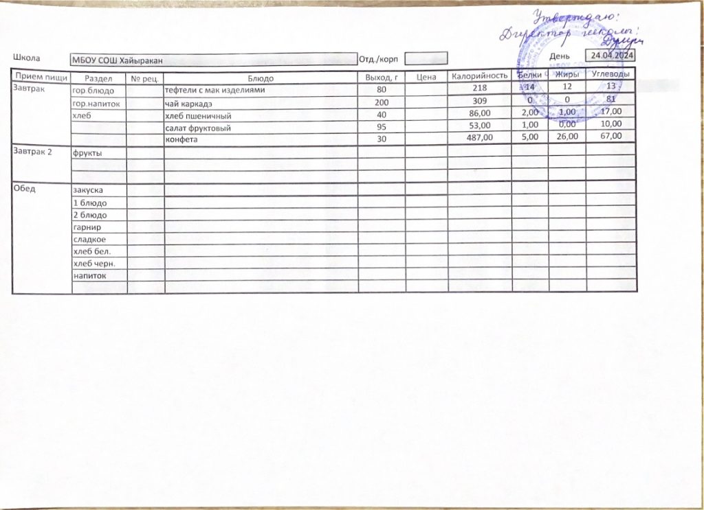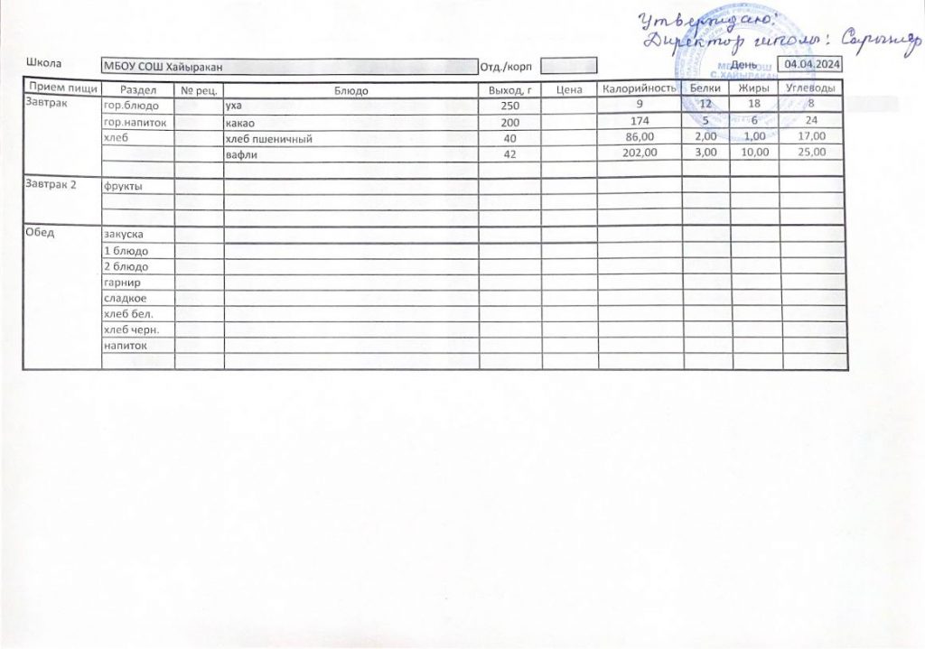 Утвержденное меню на 04 апреля 2024 года