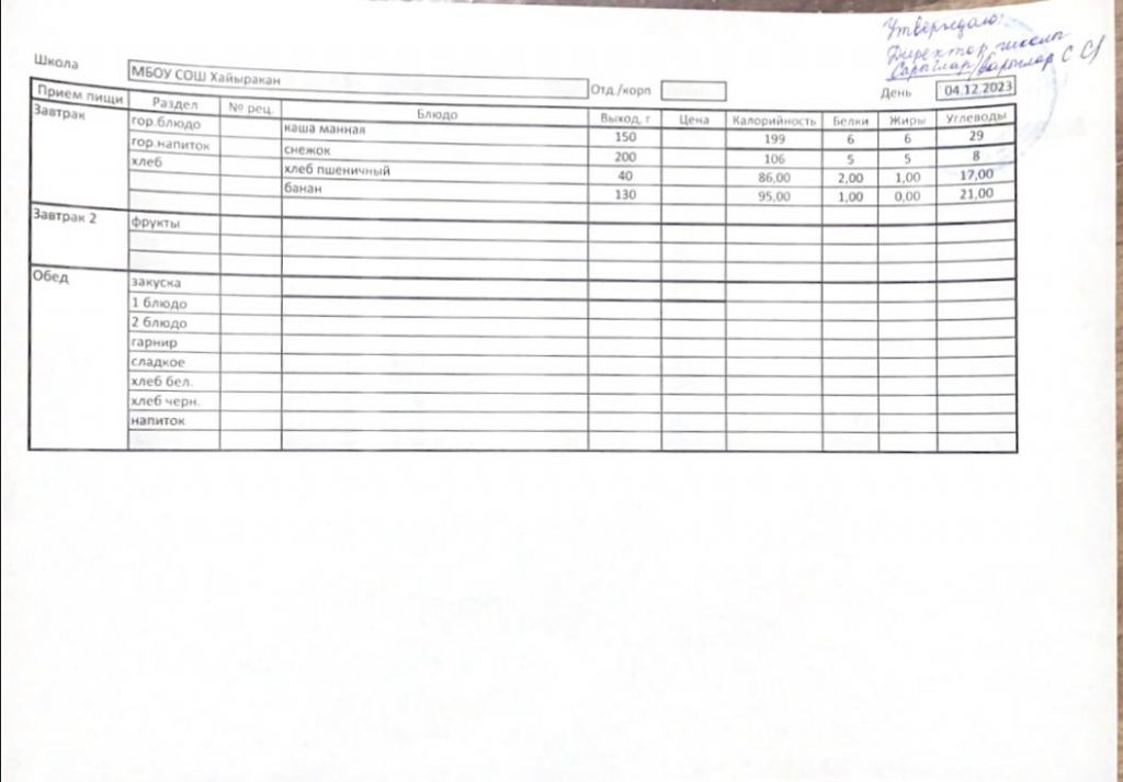 Утвержденное меню на 04 декабря 2023 года