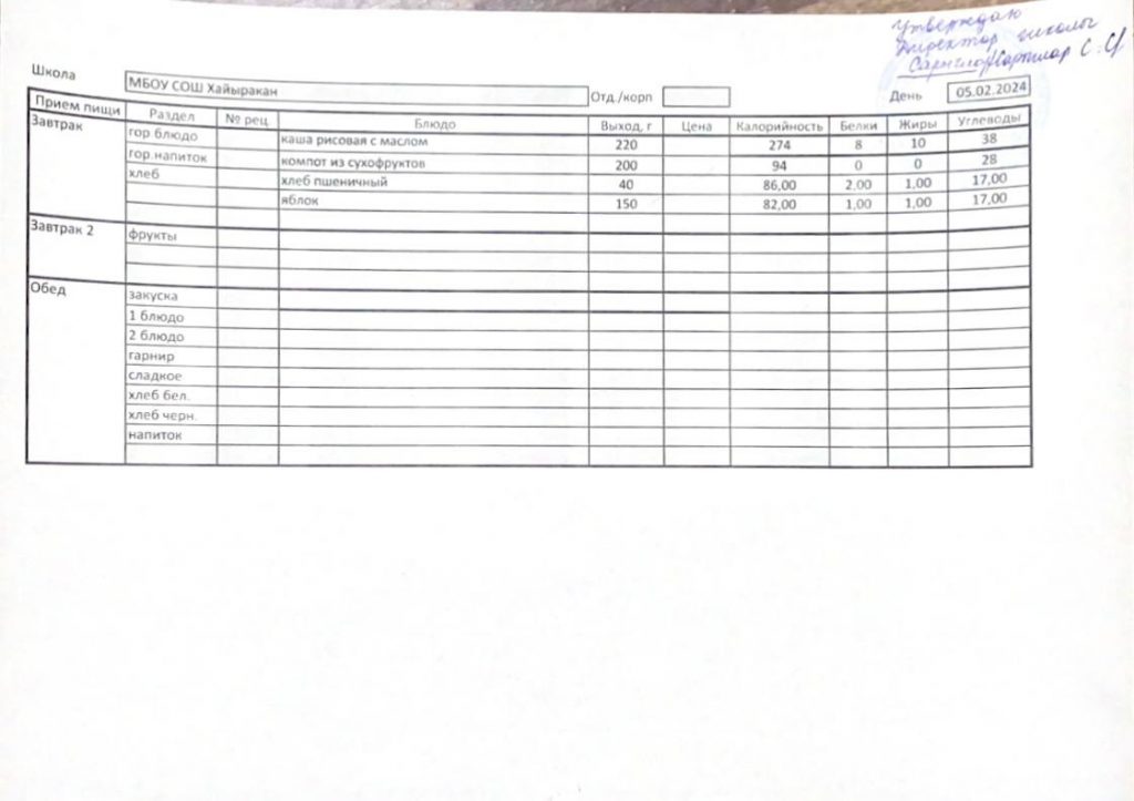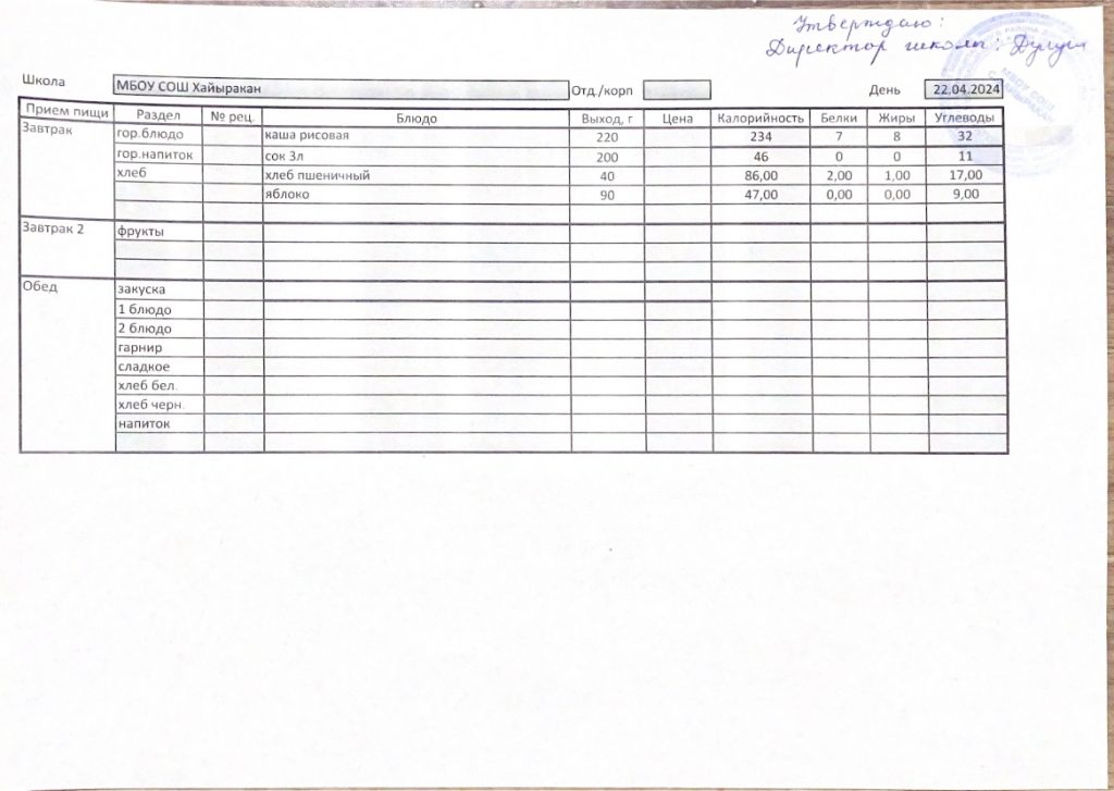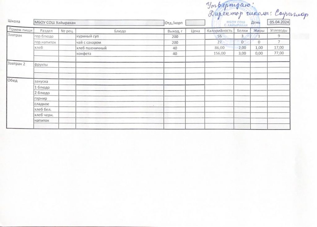 Утвержденное меню на 05 апреля 224 года