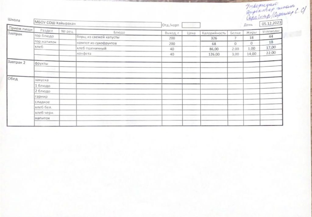 Утвержденное меню на 05 декабря 2023 года