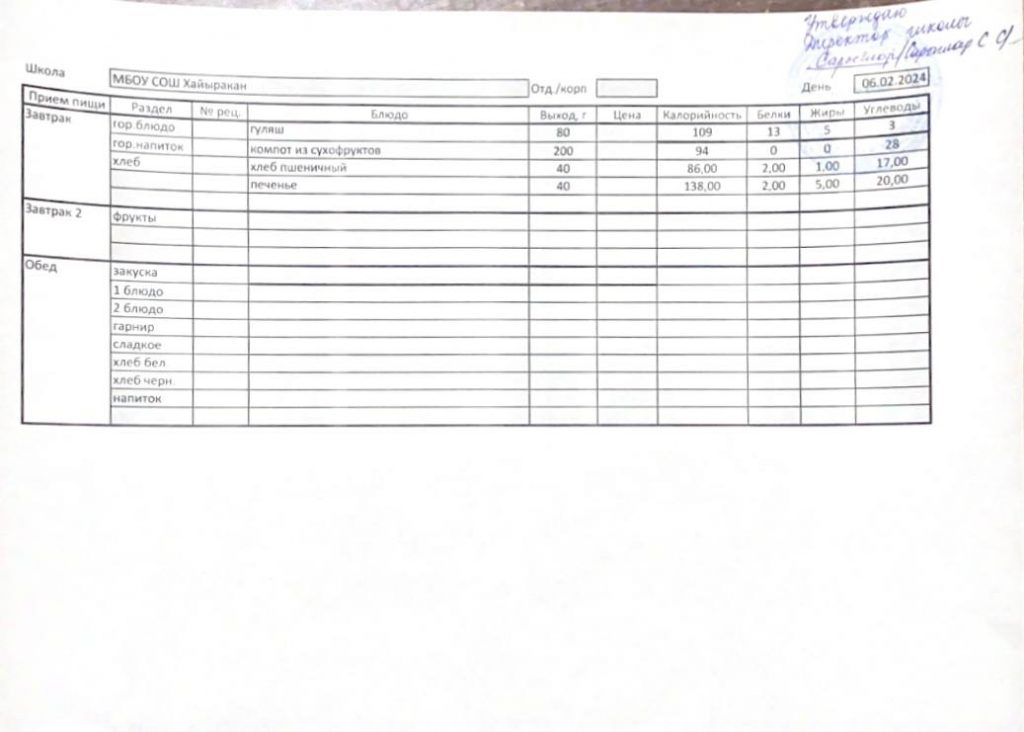 Утвержденное меню на 06 февраля 2024 года