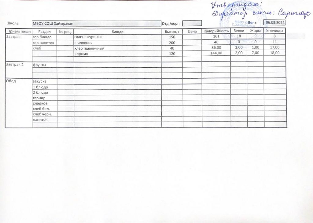 Утвержденное меню на 06 марта 2024 года