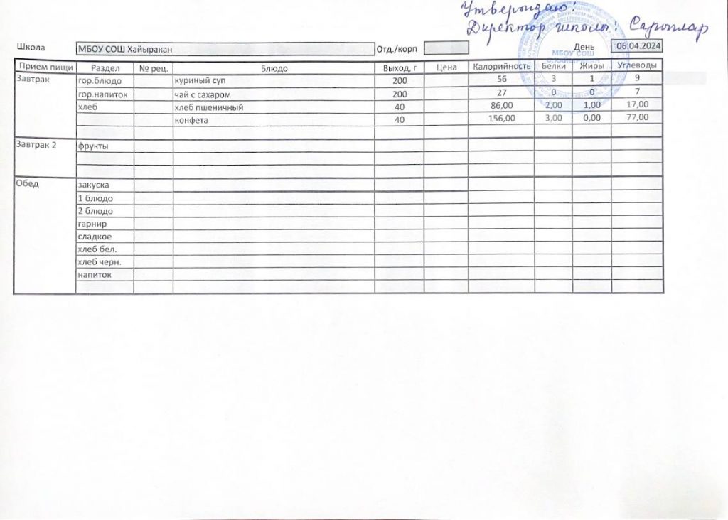 Утвержденное меню на 06 апреля 2024 года