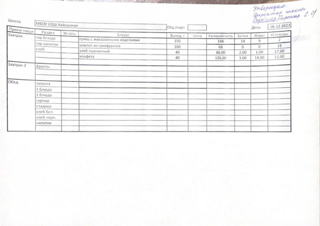 Утвержденное меню на 06 декабря 2023 года