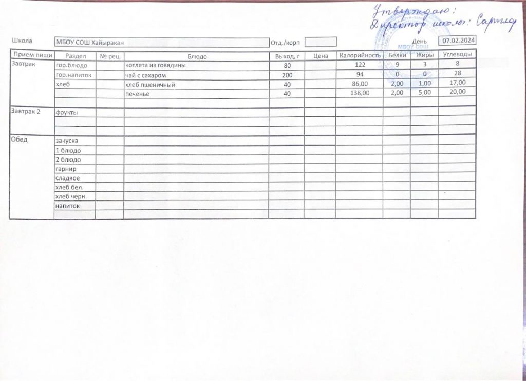 Утвержденное меню на 07 февраля 2024 года