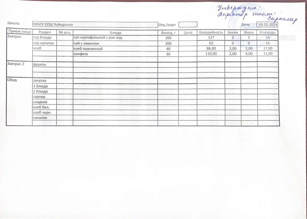 Утвержденное меню на 08 февраля 2024 года