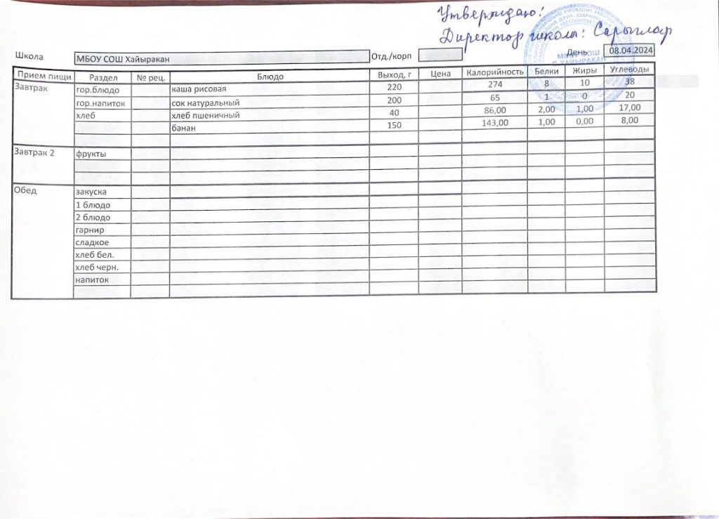 Утвержденное меню на 08 апреля 2024 года