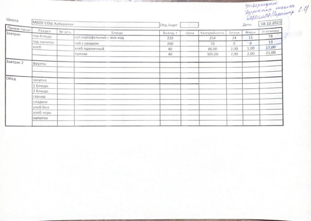 Утвержденное меню на 08 декабря 2023 года