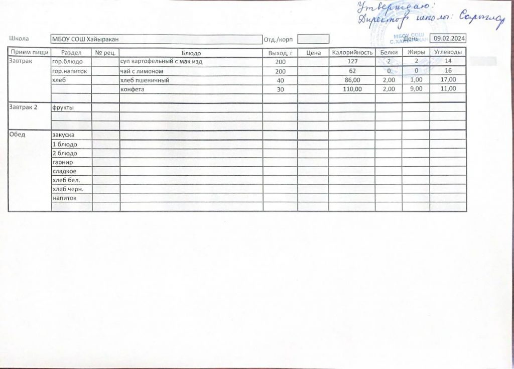 Утвержденное меню на 9 декабря 2024 года.