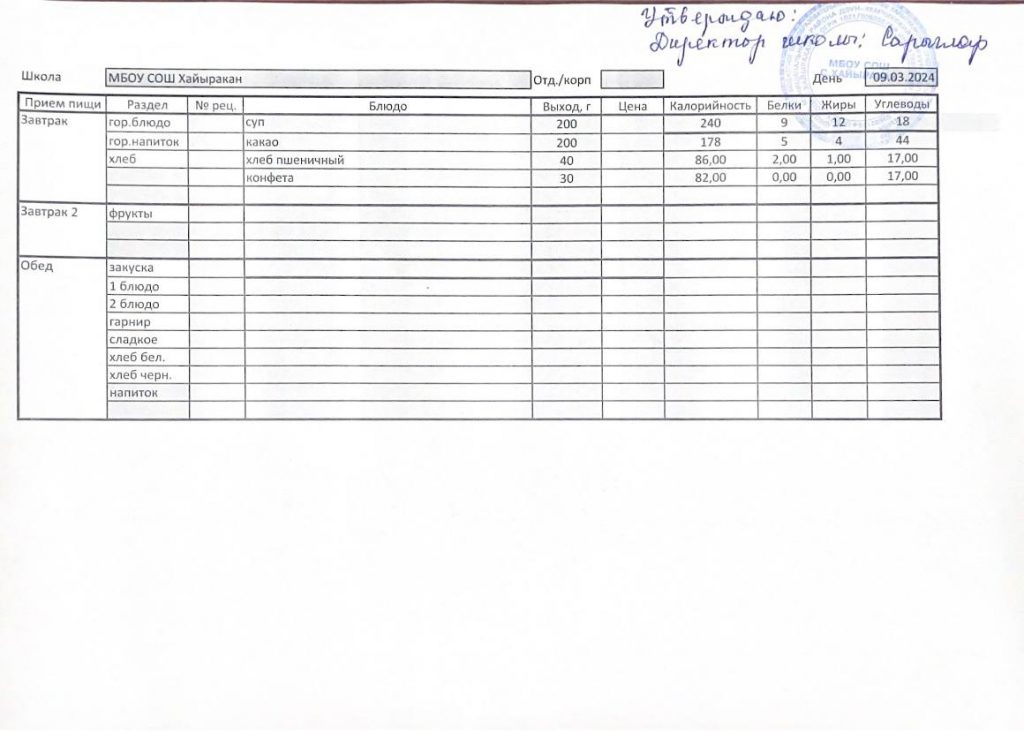 Утвержденное меню на 09 марта 2024 года