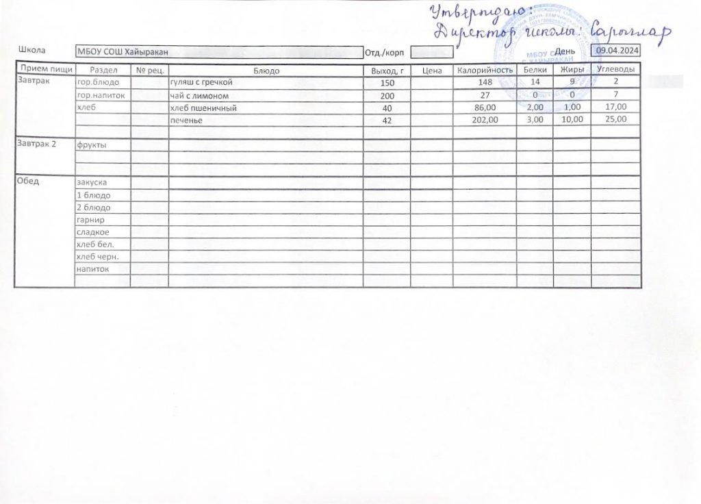 Утвержденное меню на 09 апреля 2024 года