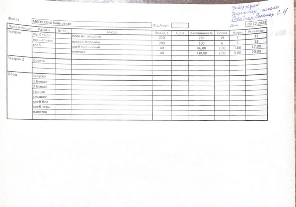 Утвержденное меню на 09 декабря 2023 года