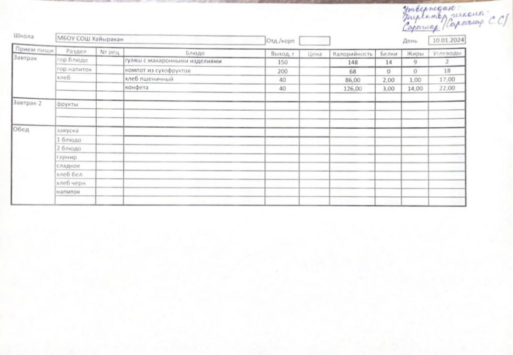Утвержденное меню на 10 января 2024 года