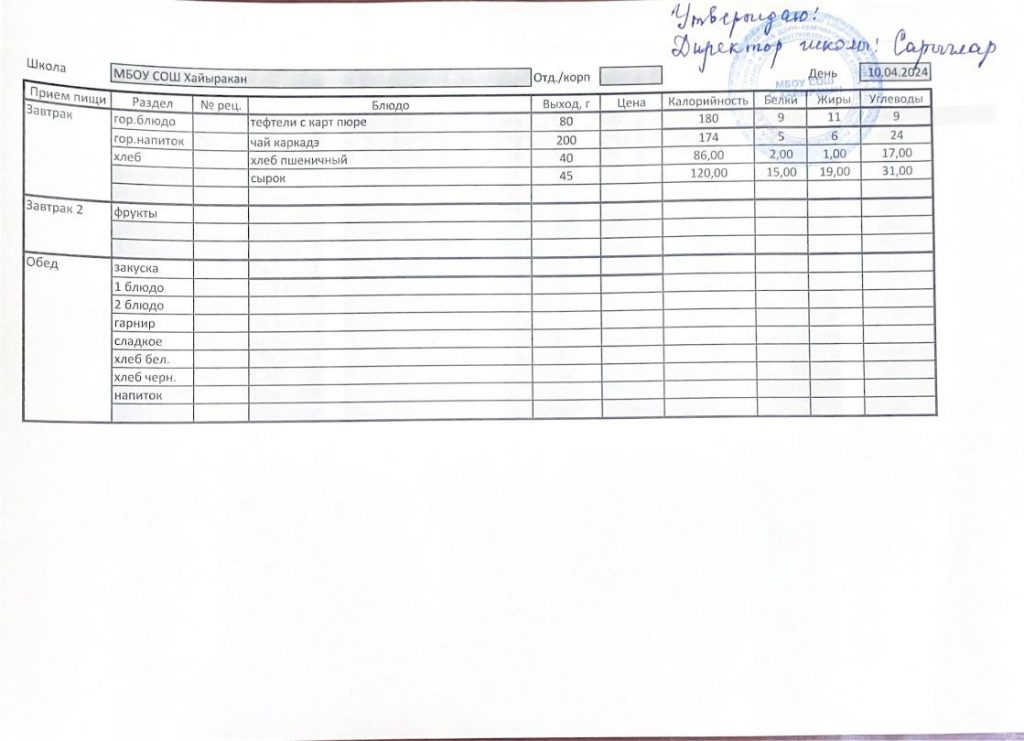 Утвержденное меню на 10 апреля 2024 года