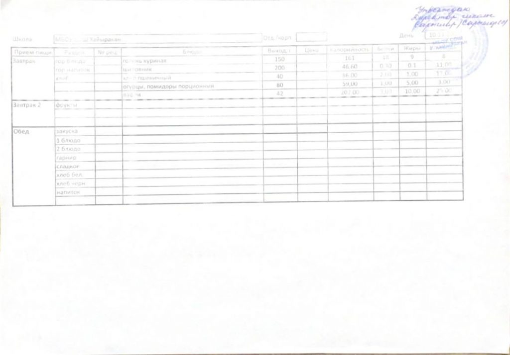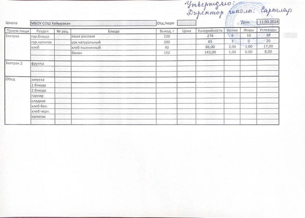 Утвержденное меню на 11 марта 2024 года