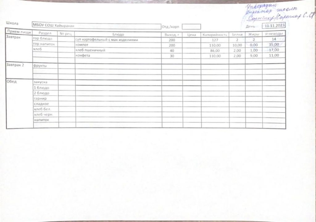 Утвержденное меню на 11 ноября 2023 года