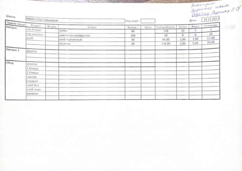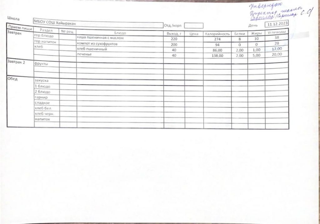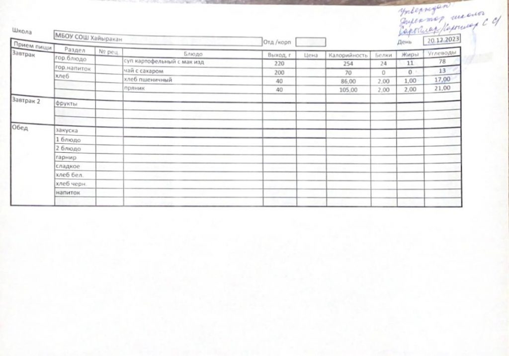 Утвержденное меню на 20 декабря 2023 года