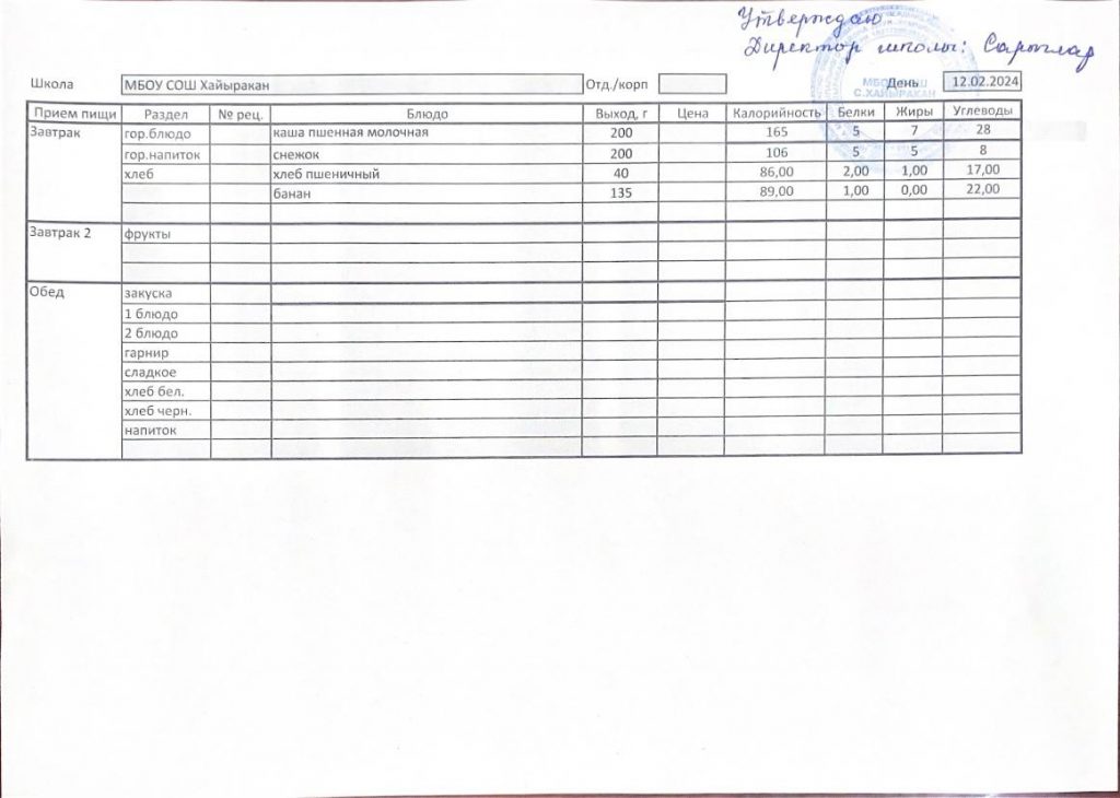 Утвержденное меню на 12 февраля 2024 года