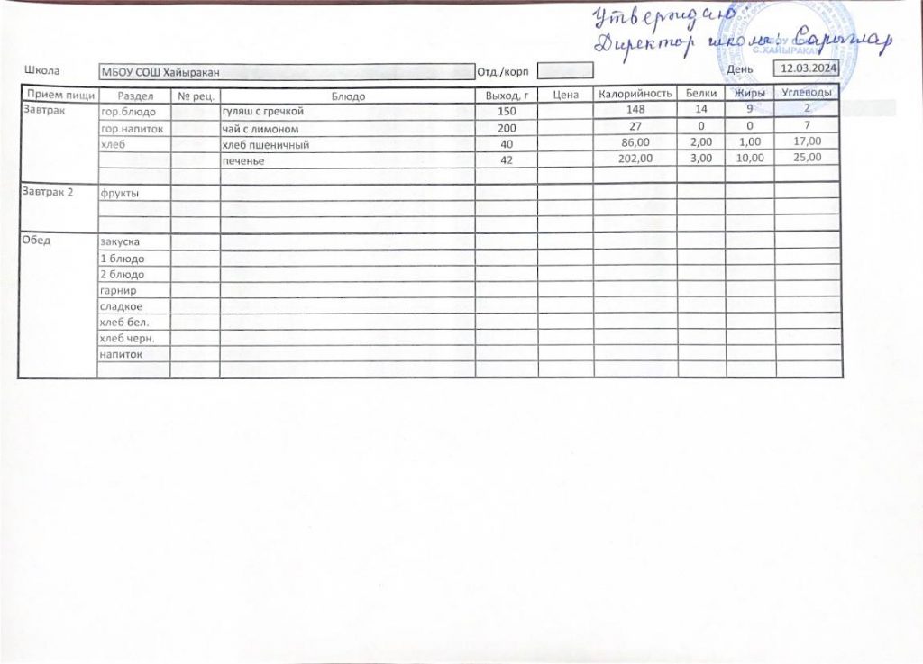 Утвержденное меню на 12 марта 2024 года
