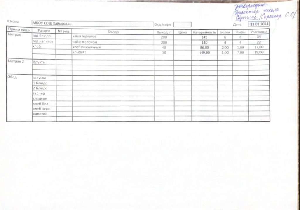 Утвержденное меню на 13 января 2024 года