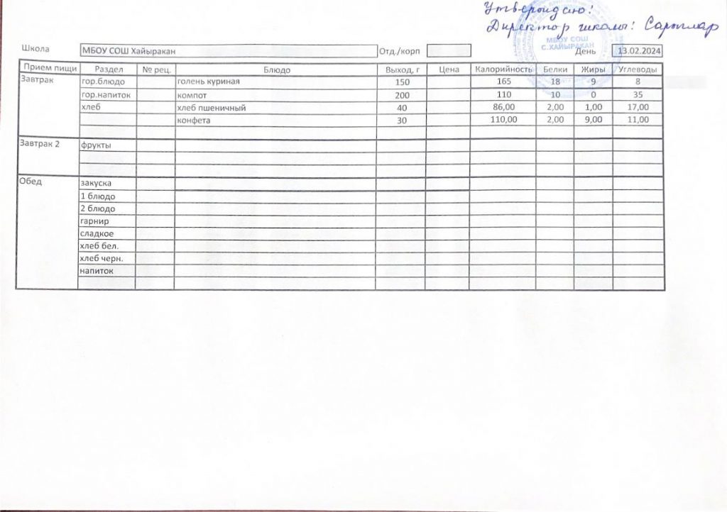 Утвержденное меню на 13 февраля 2024 года