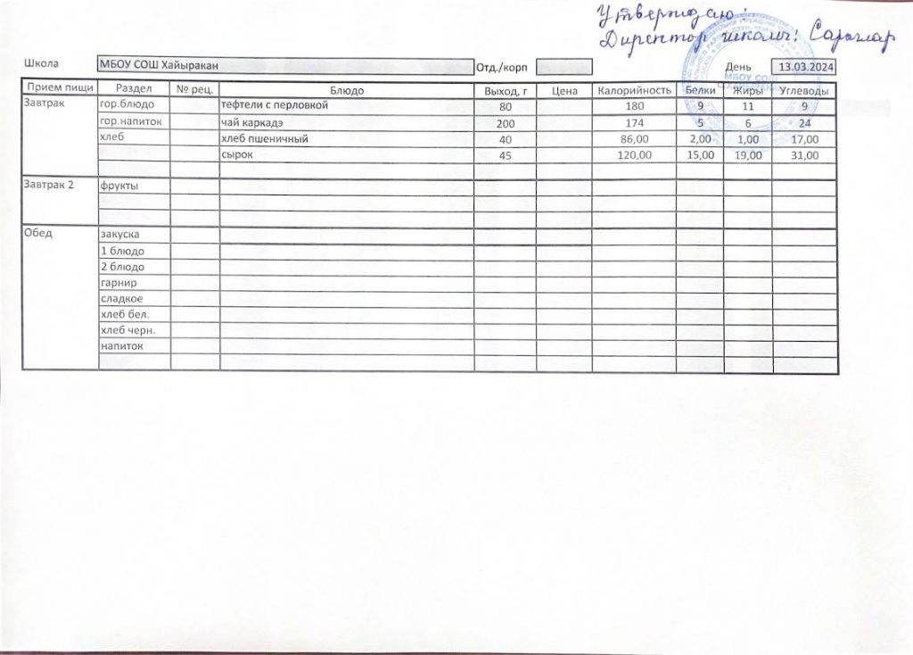 Утвержденное меню на 13 марта 2024 года