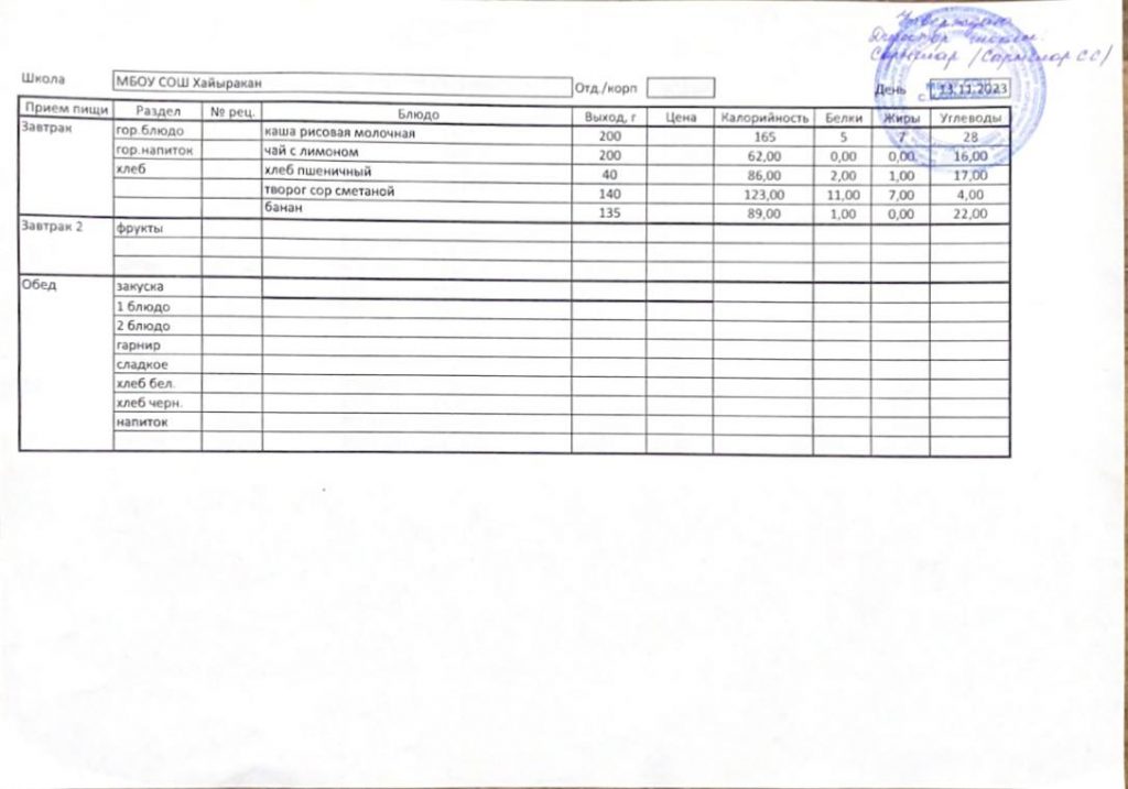 Утвержденное меню на 13 ноября 2023 года