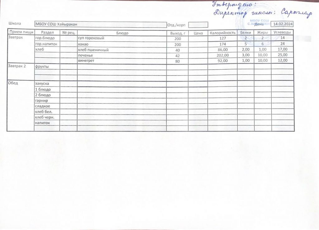Утвержденное меню на 14 февраля 2024 года