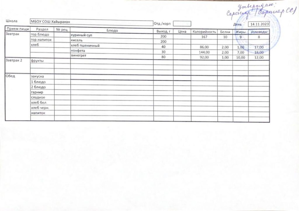 Утвержденное меню на 14 ноября 2023 года