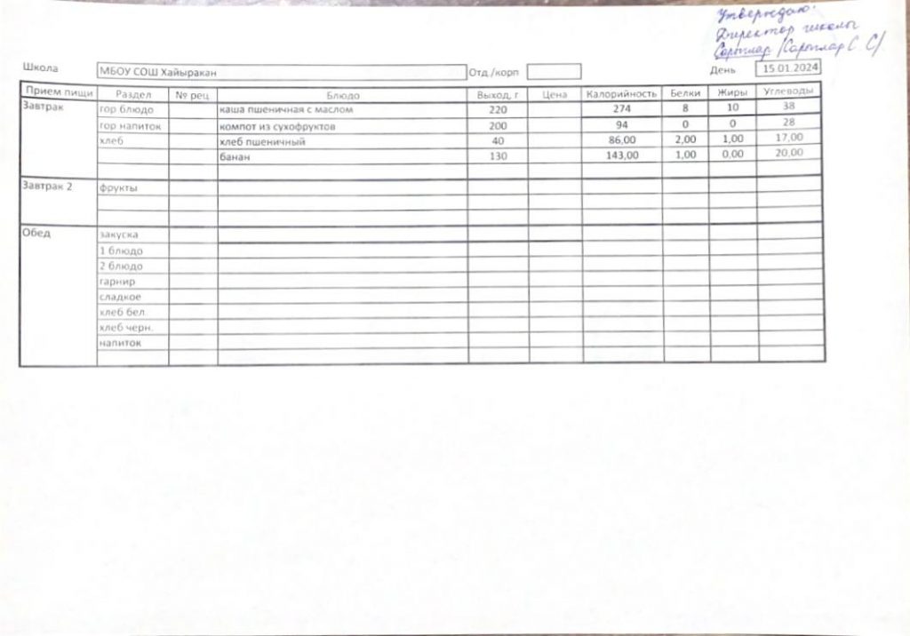 Утвержденное меню на 15 января 2024 года