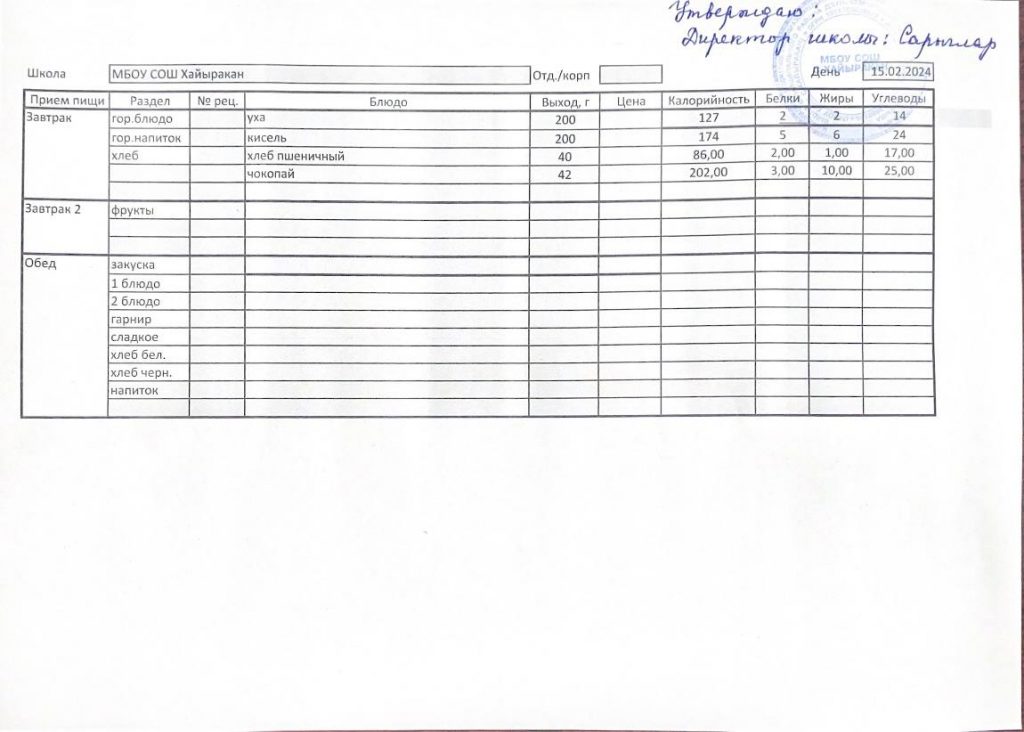 Утвержденное меню на 15 февраля 2024 года