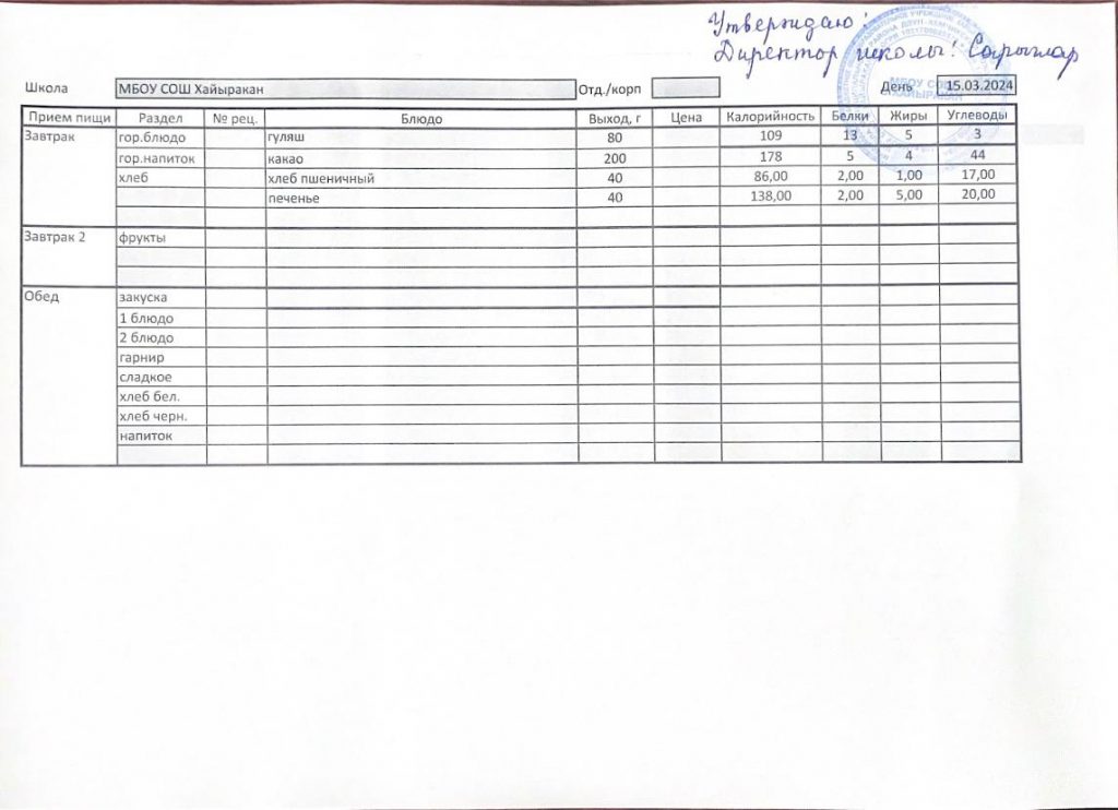 Утвержденное меню на 15 марта 2024 года
