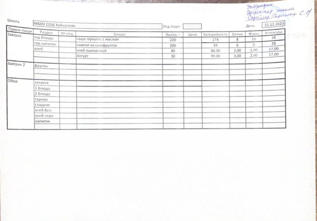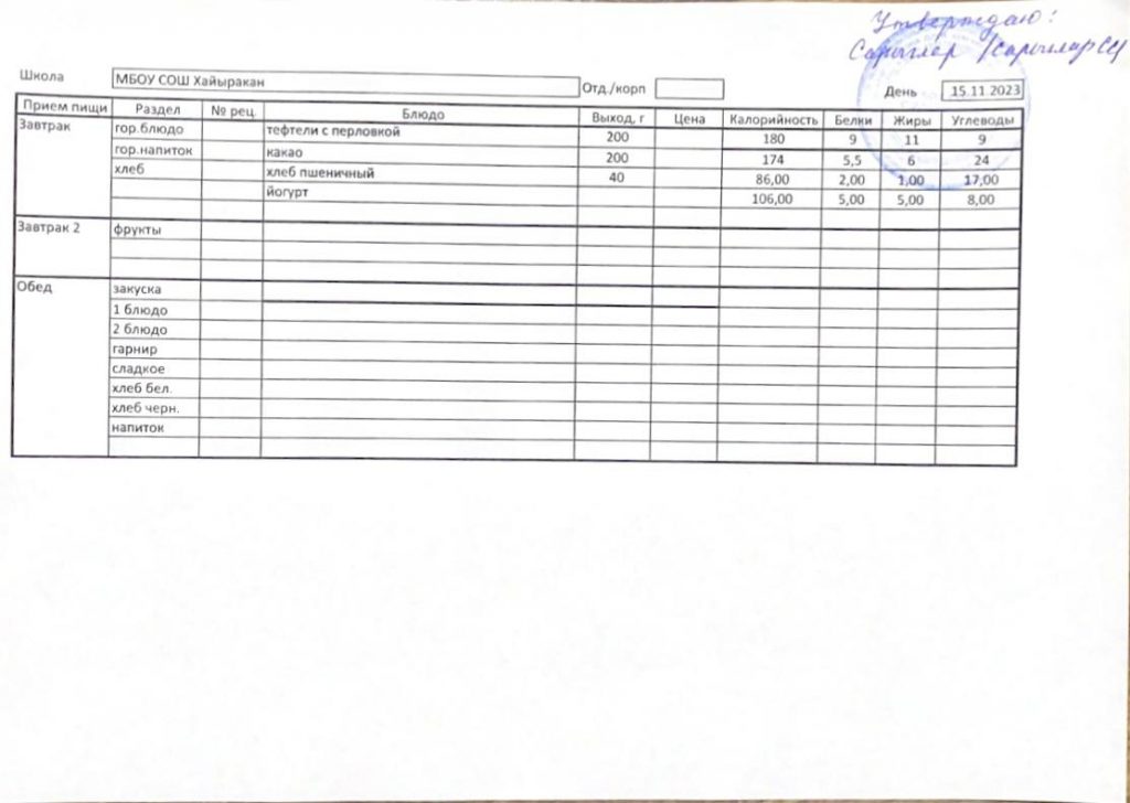 Утвержденное меню на 15 ноября 2023 года