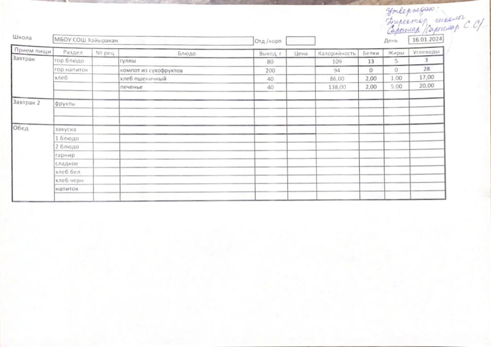 Утвержденное меню на 16 января 2024 года