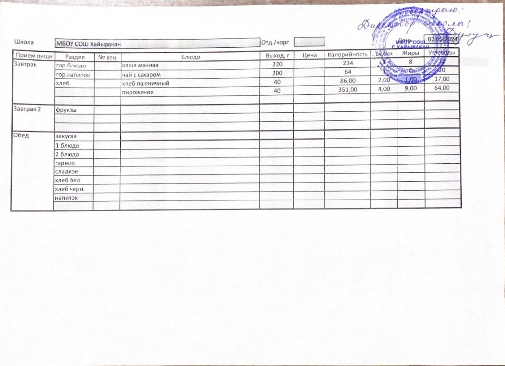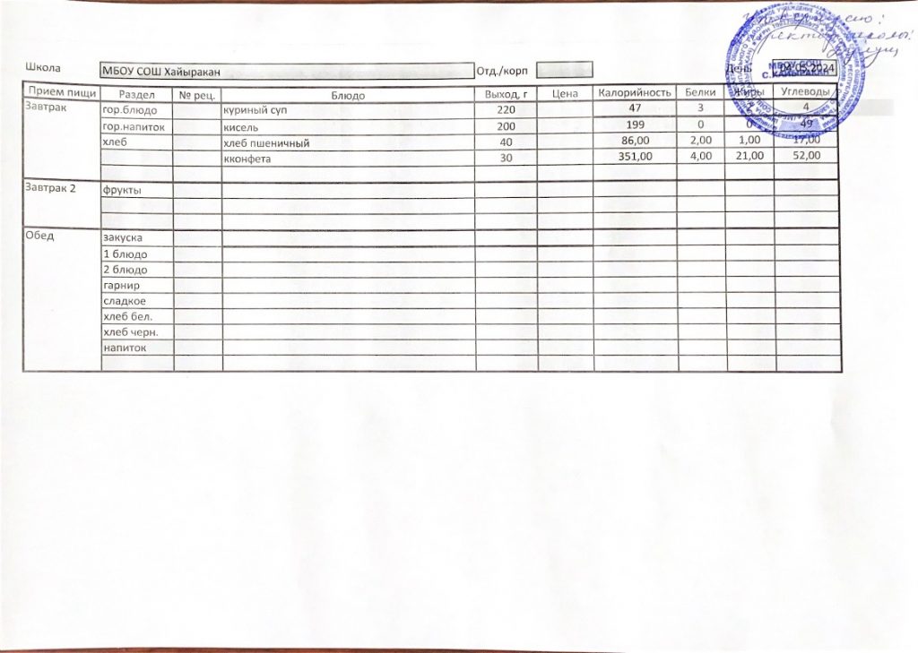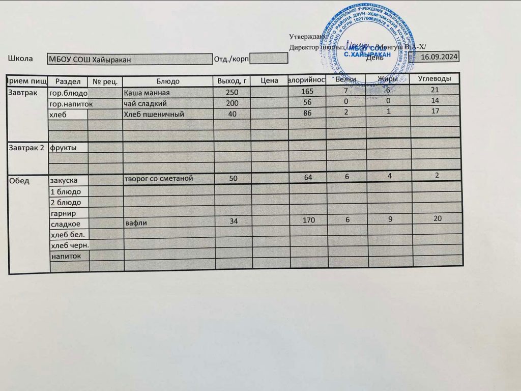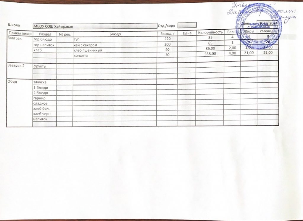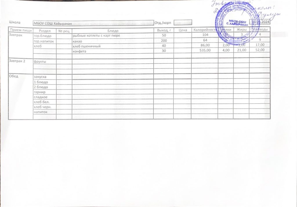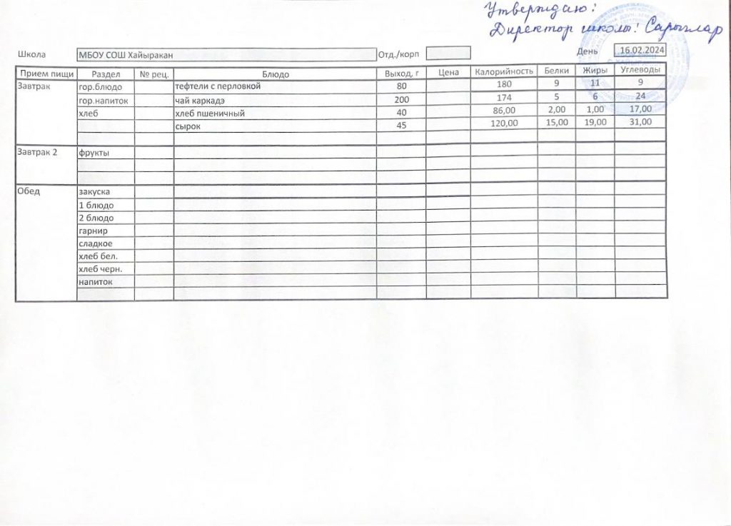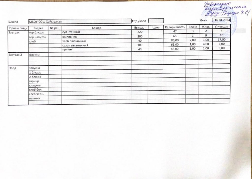 Утвержденное меню на 16 мая 2024 года