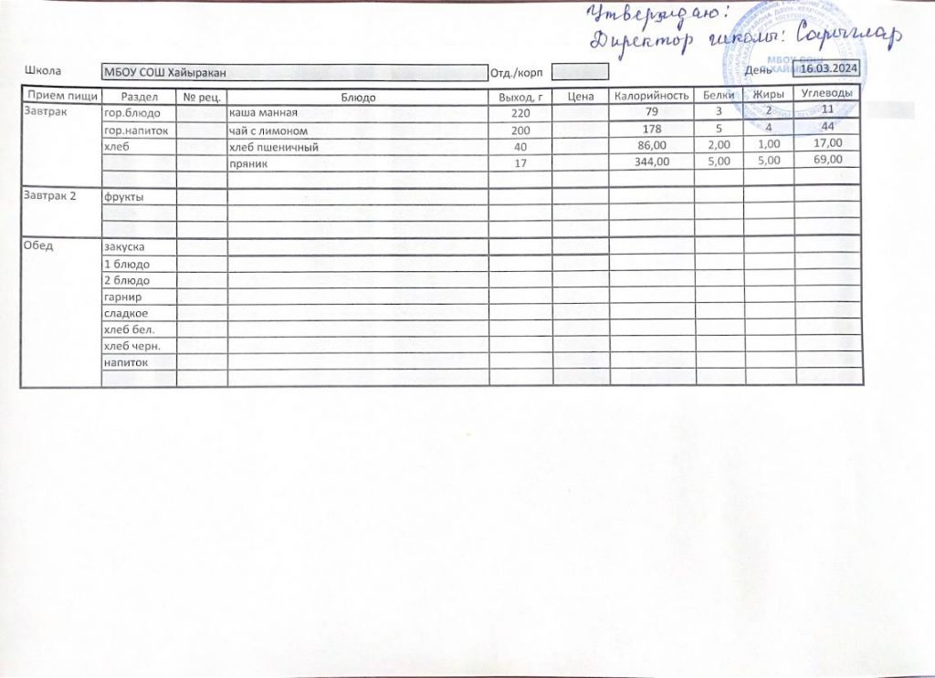 Утвержденное меню на 16 марта 2024 года
